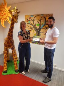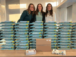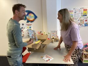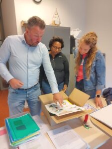 Samen met collega’s de kinderboekenboxen maken in de kantine van ons kantoor
