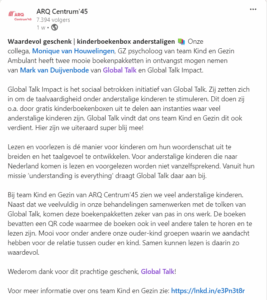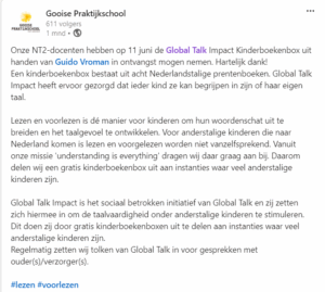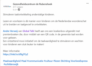 Met dit project komen we in actie om de taalontwikkeling van anderstalige kinderen te ondersteunen. Lezen en voorlezen is dé manier voor kinderen om de Nederlandse woordenschat uit te breiden en het taalgevoel te ontwikkelen. Voor anderstalige kinderen is lezen en voorgelezen worden niet altijd vanzelfsprekend.
